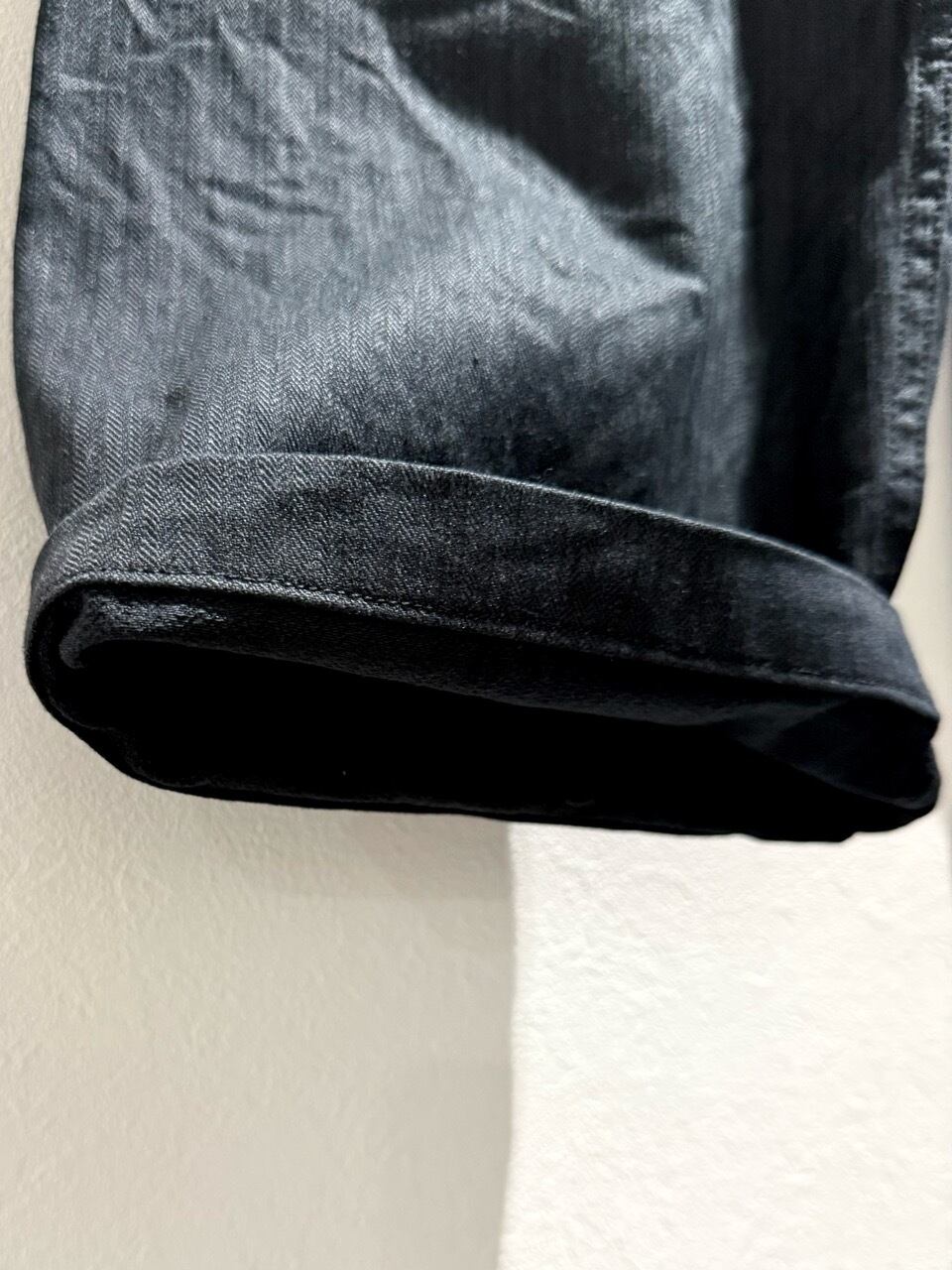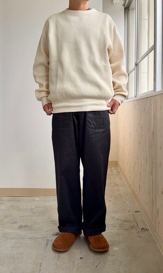 US NAVYパンツを参考に、脇に縫い目がない所謂"巻き"の仕様で、ヒップから裾にかけてストンと綺麗に落ちるシルエットです。