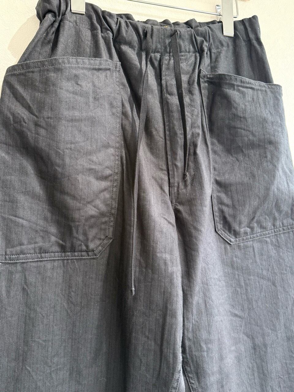 3パッチポケットのシンプルなデザインで、ウエストにはゴムを通してドローコードでアジャストできるイージーパンツ仕様です。