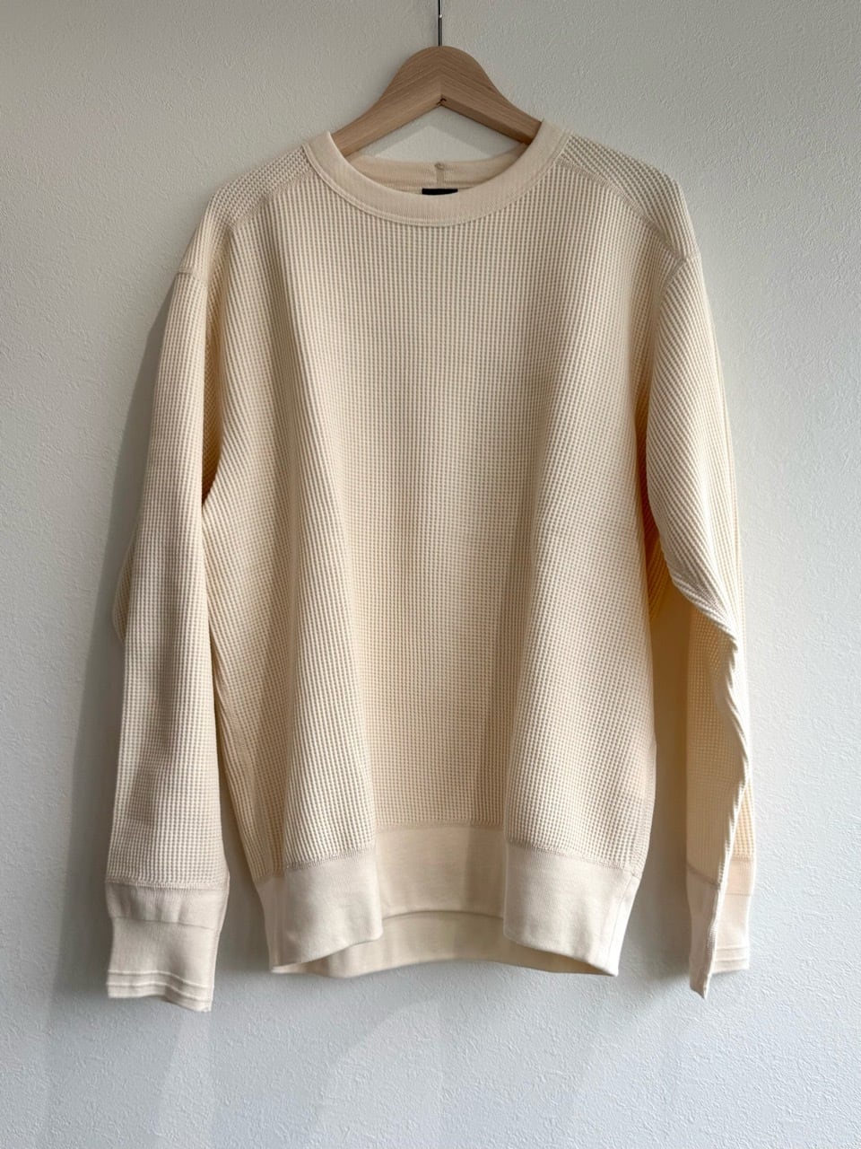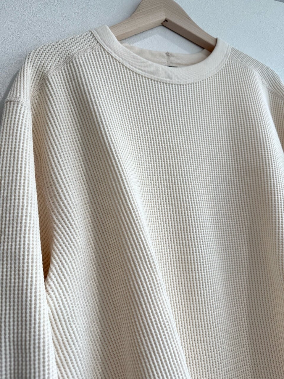 古い編み立て機を使用して編み上げた、肉厚のローゲージワッフル地を使ったクルーネックです。