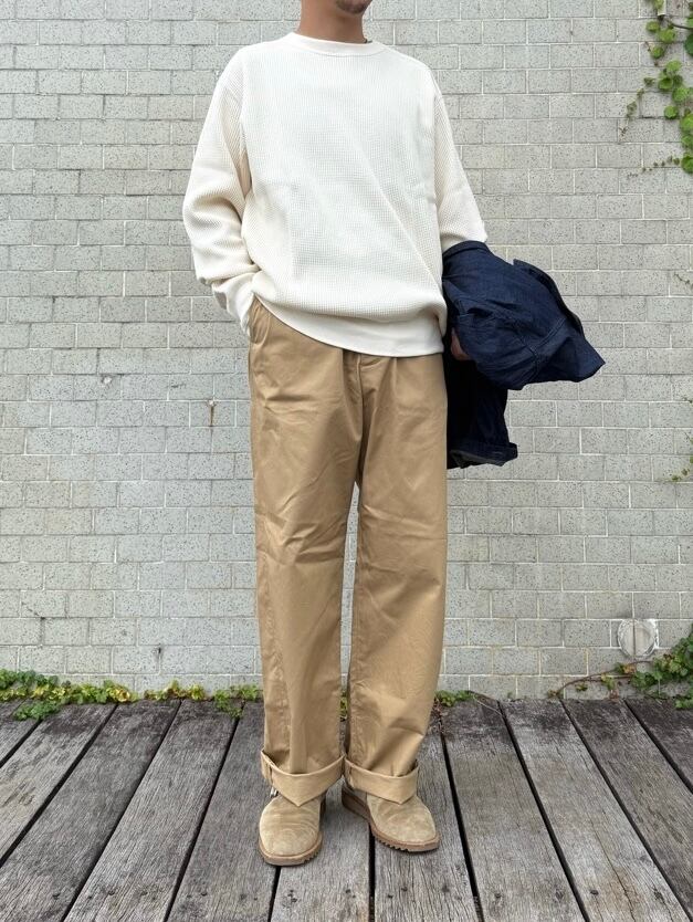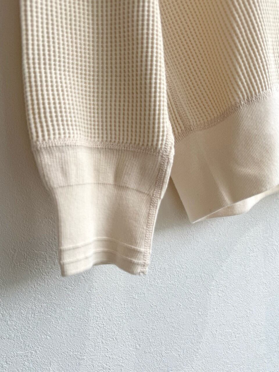 凹凸のあるビッグワッフル生地は肌当たりが良く、一枚着としても、シャツやアウターのインナーとしても活躍します。