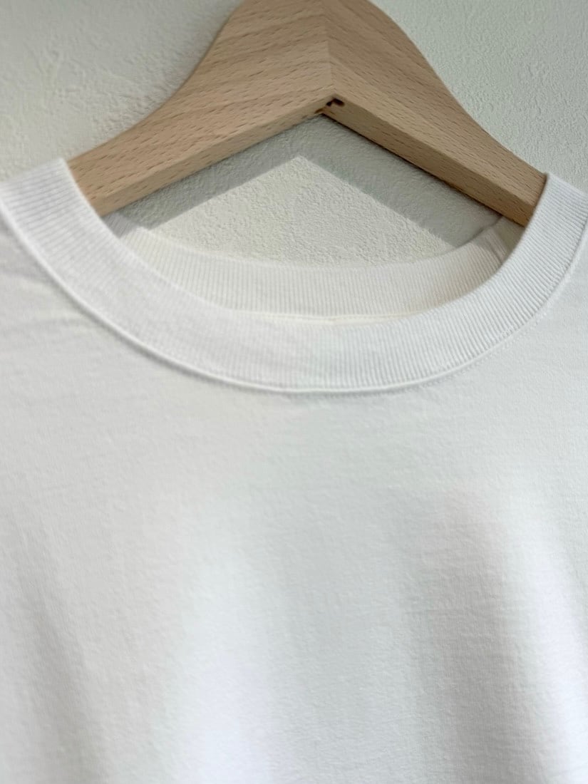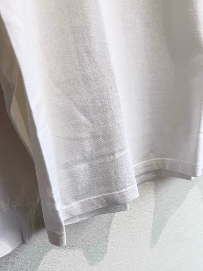 Yonetomi NEW BASIC T-SHIRTに長袖が新登場。 インナーとしてのTシャツは少し透ける、ヘビーウエイトだと厚みがあってインナーとの兼用ができない。目指したのは、そうした悩みを解決した「ちょうどいい」1枚。 衿・袖口はニット、ボディは生地がドッキングしたリブ部分が伸びにくい仕様です。