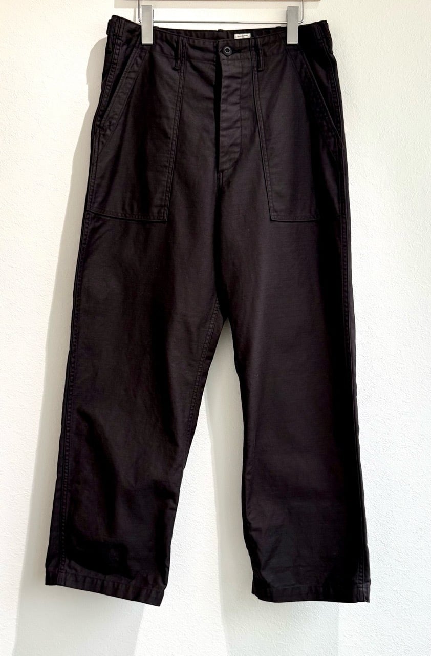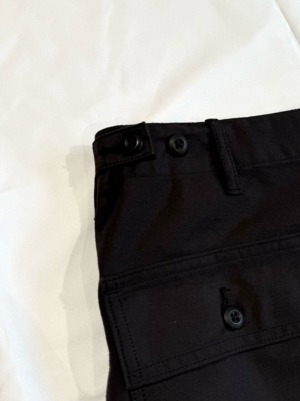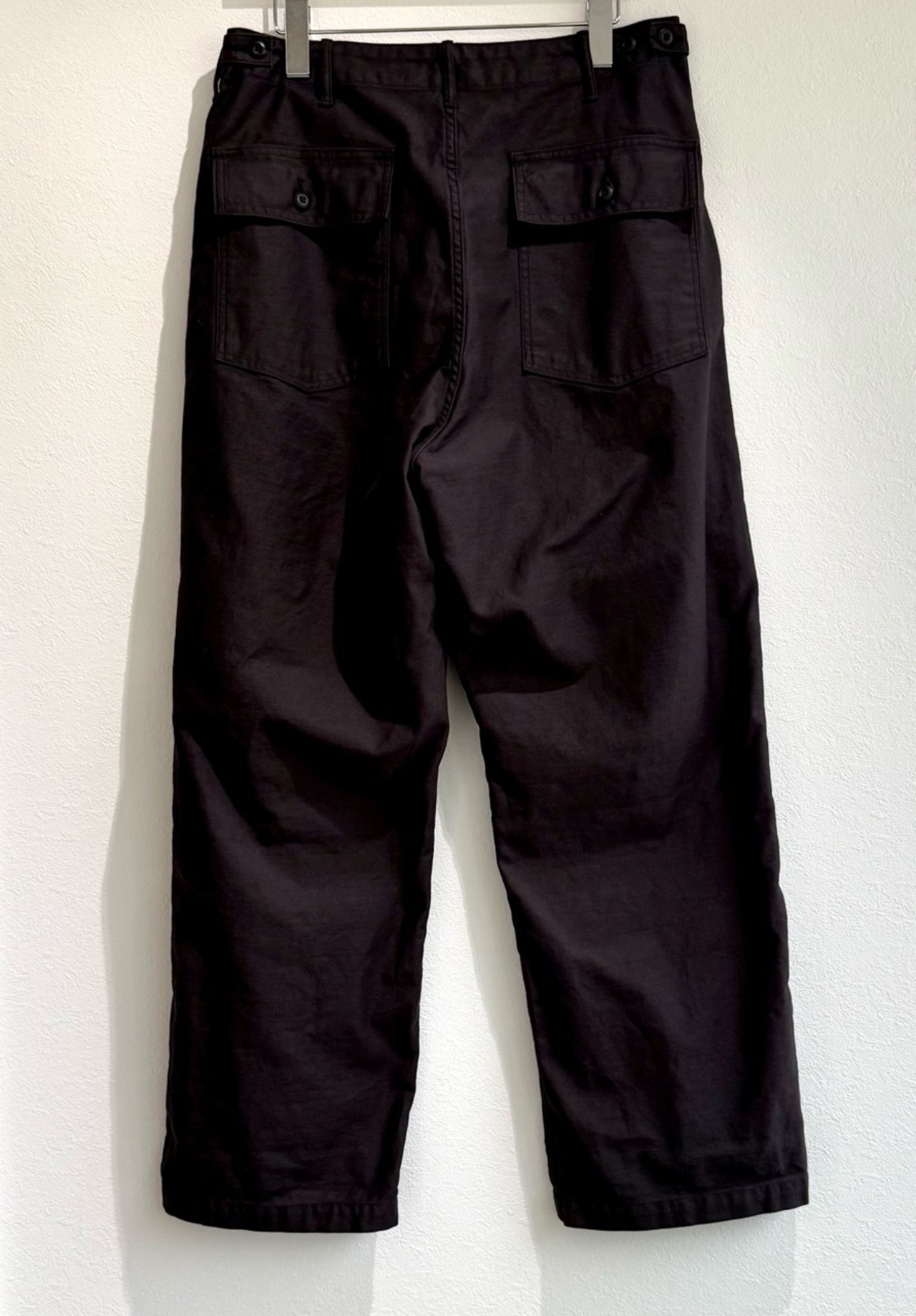 ミリタリー定番のバックサテン生地を使用し、穿き込むほどに風合いが増していく一本です。やや太めのシルエットで、無骨さとリラックス感を兼ね備えたバランスの良いデザイン。経年変化を楽しみながら、日常のコーディネートに取り入れやすいファティーグパンツです。