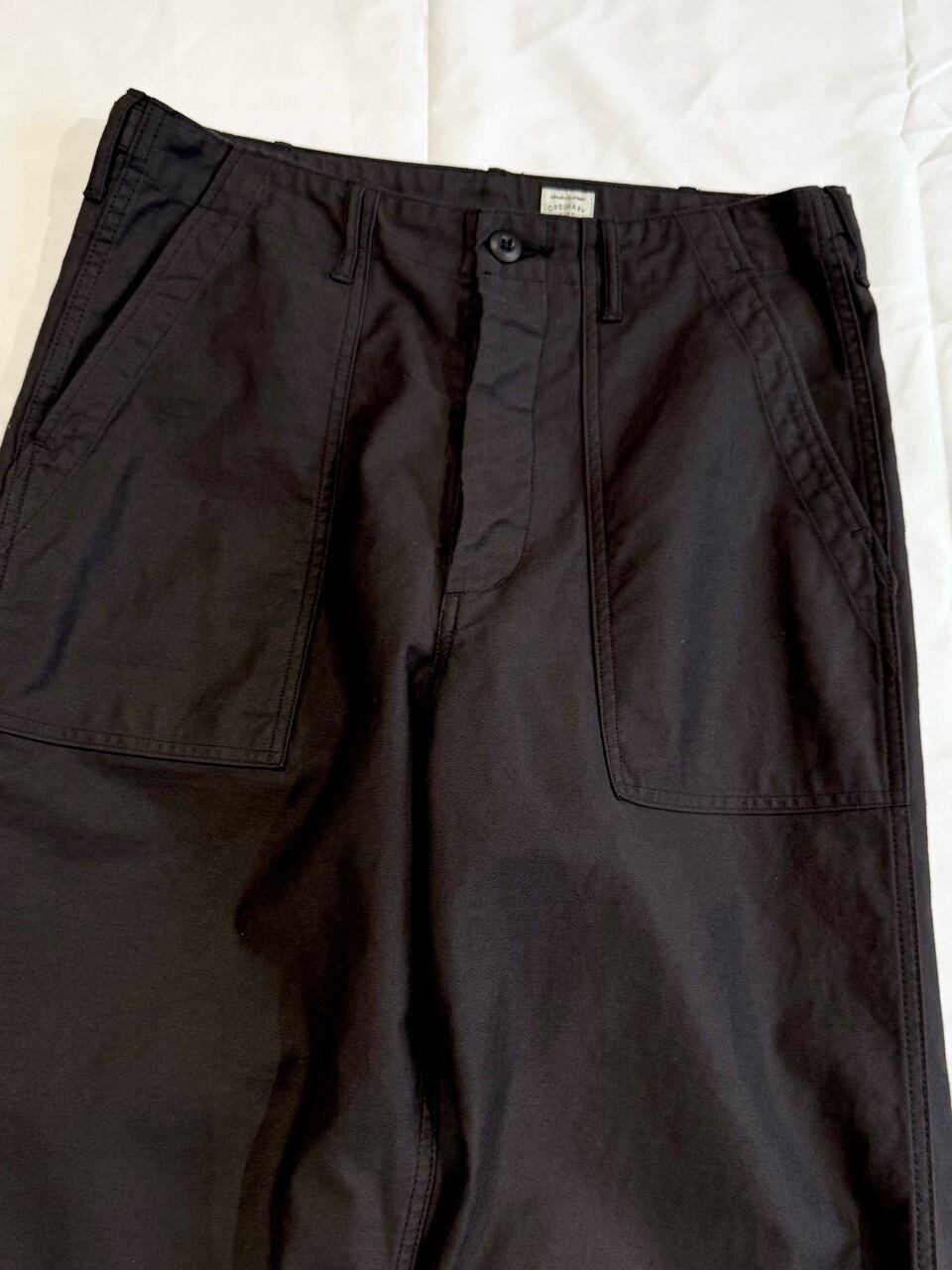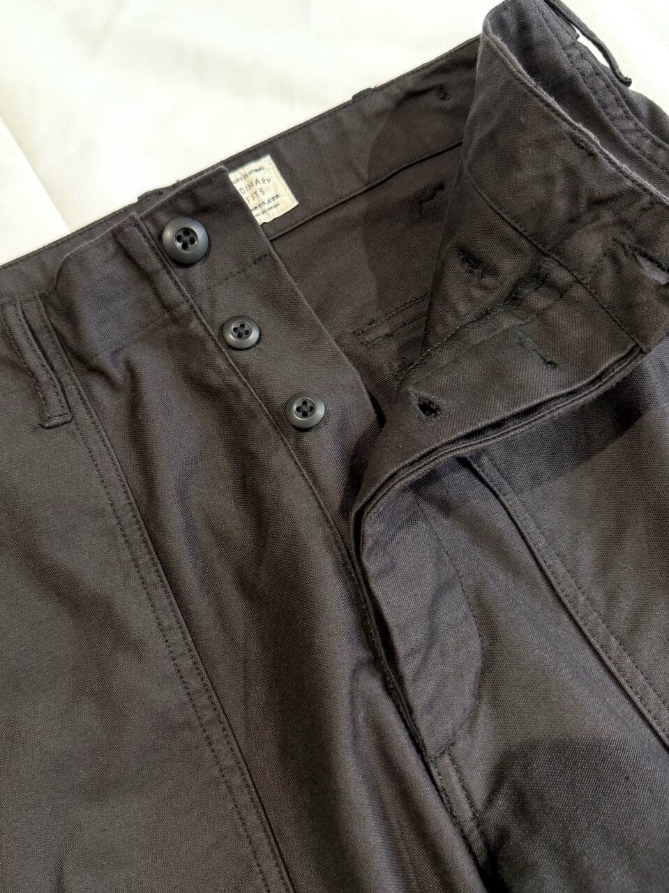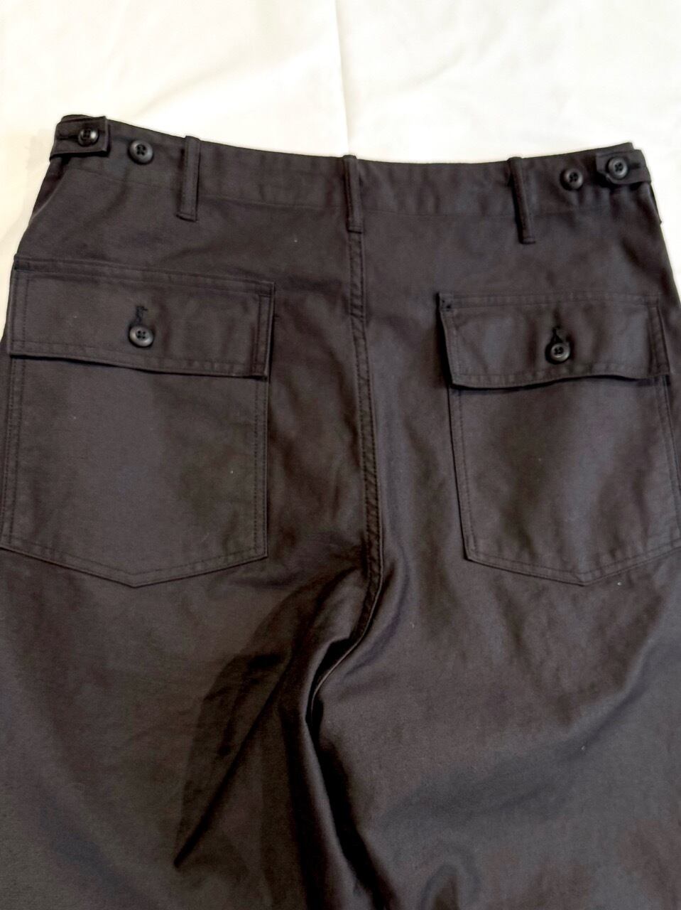 ミリタリー定番のバックサテン生地を使用し、穿き込むほどに風合いが増していく一本です。やや太めのシルエットで、無骨さとリラックス感を兼ね備えたバランスの良いデザイン。経年変化を楽しみながら、日常のコーディネートに取り入れやすいファティーグパンツです。