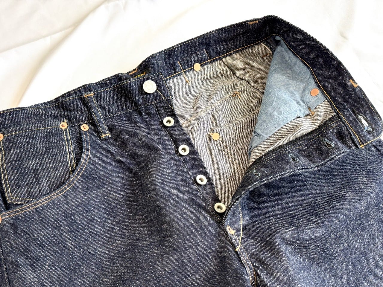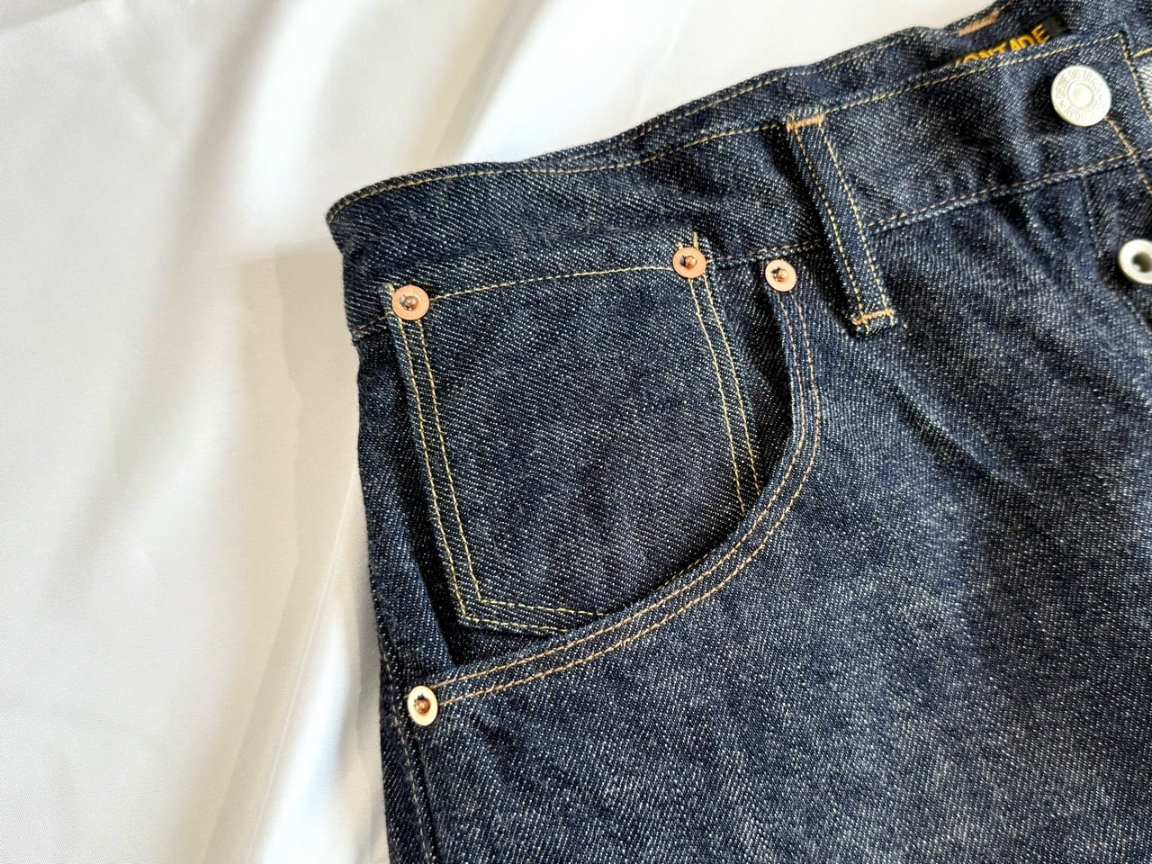深みのあるインディゴの色合いと控えめな縦落ち感が特徴です。