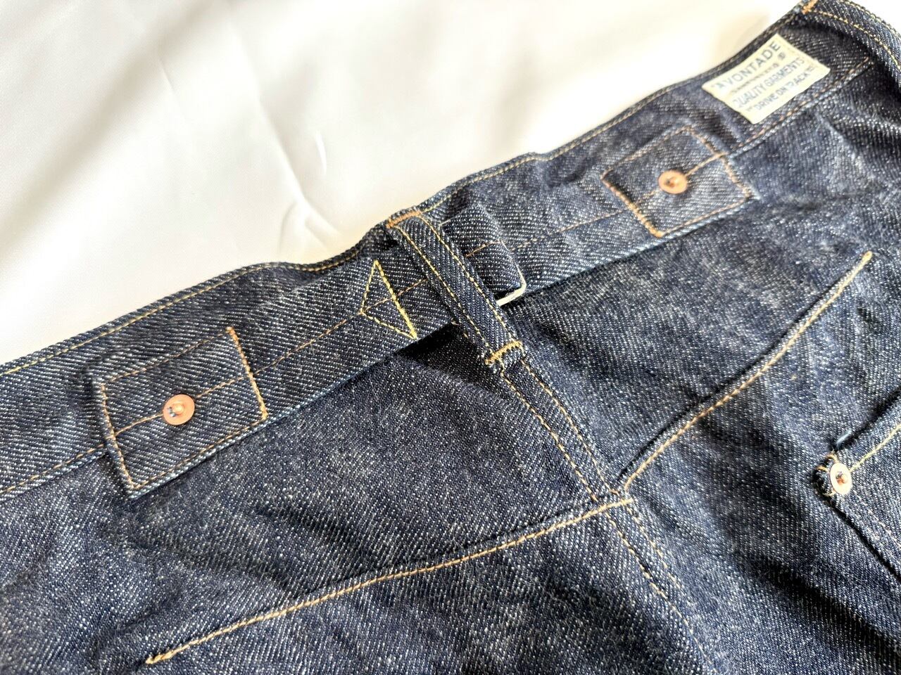 鉄製のオリジナルタックボタン、打ち抜きリベット、2本針のバックル、細巾のステッチワークなど当時のイメージを踏襲しつつ、オリジナリティーあるデザインに。