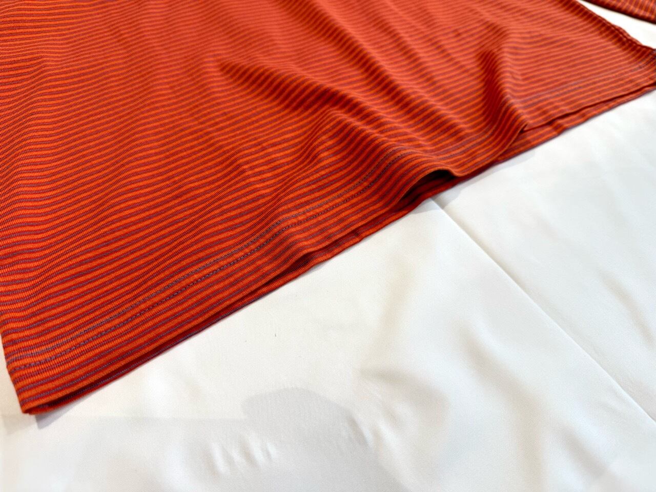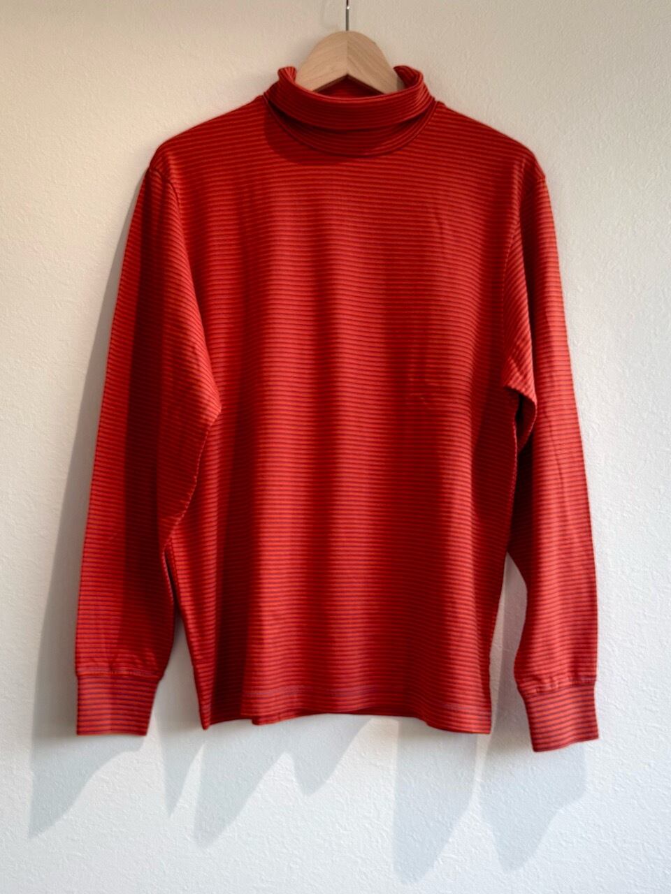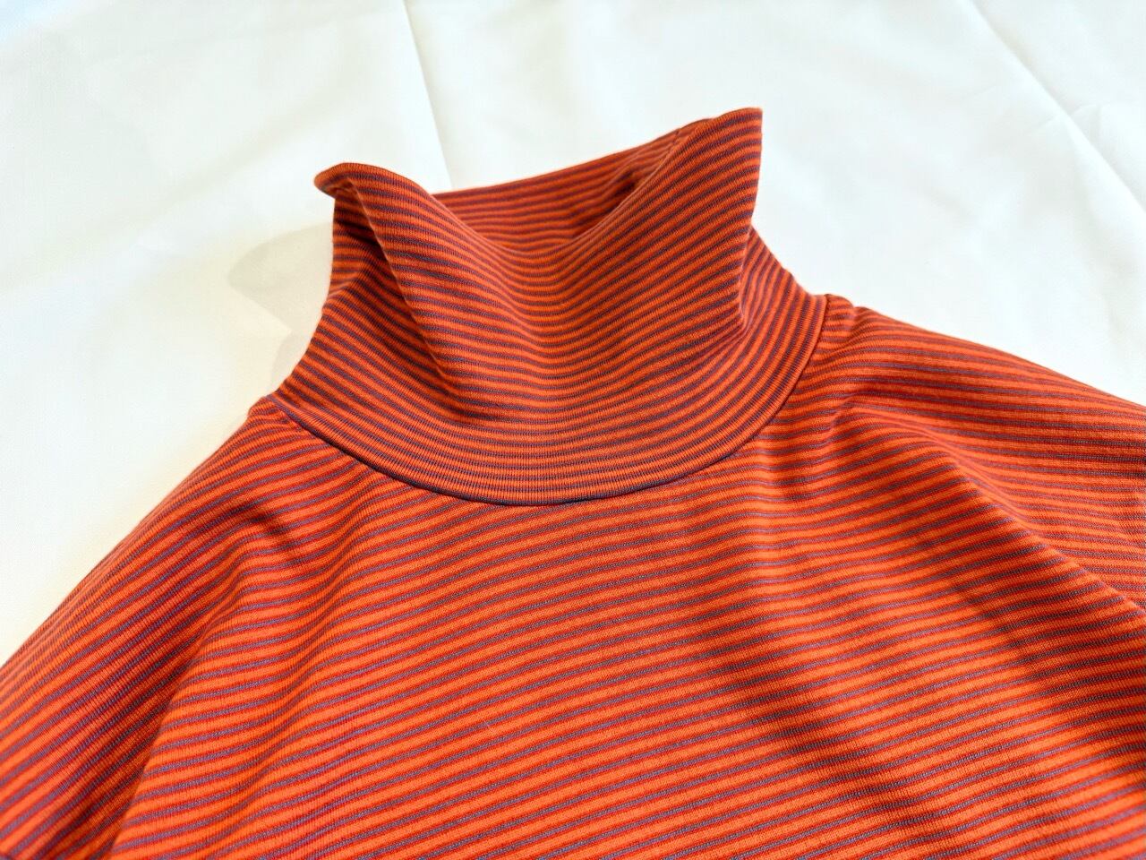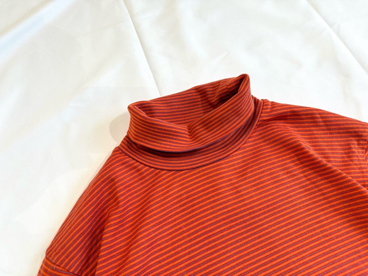 無地感覚で着られる細ピッチボーダーTシャツ、新型のタートルネック。綿2種類・ポリエステル1種類の染着差を利用し、染色するとストライプが浮き出てくる特注素材を使用しています。