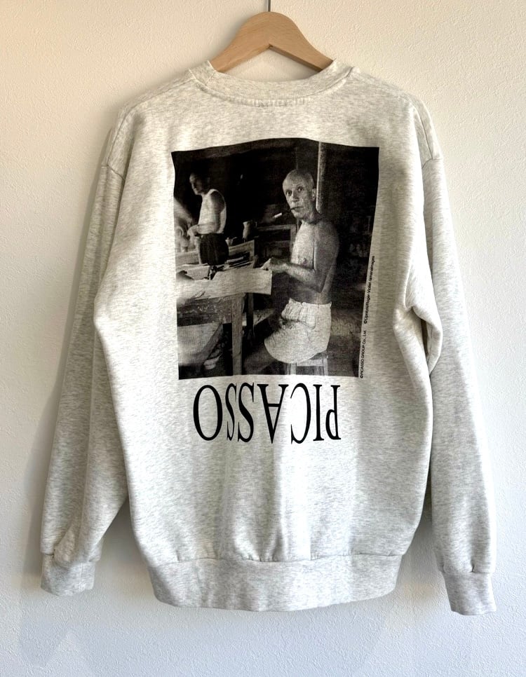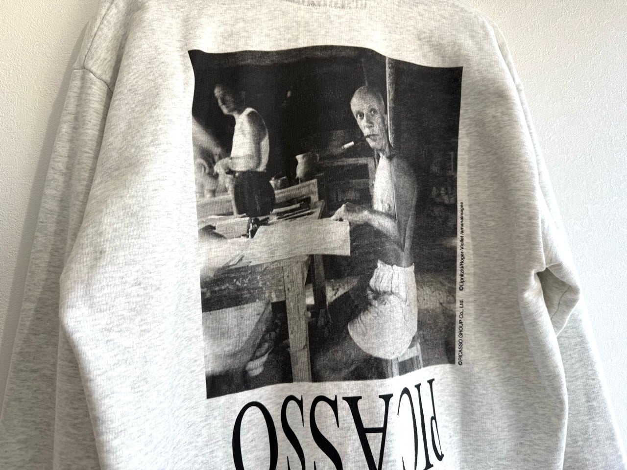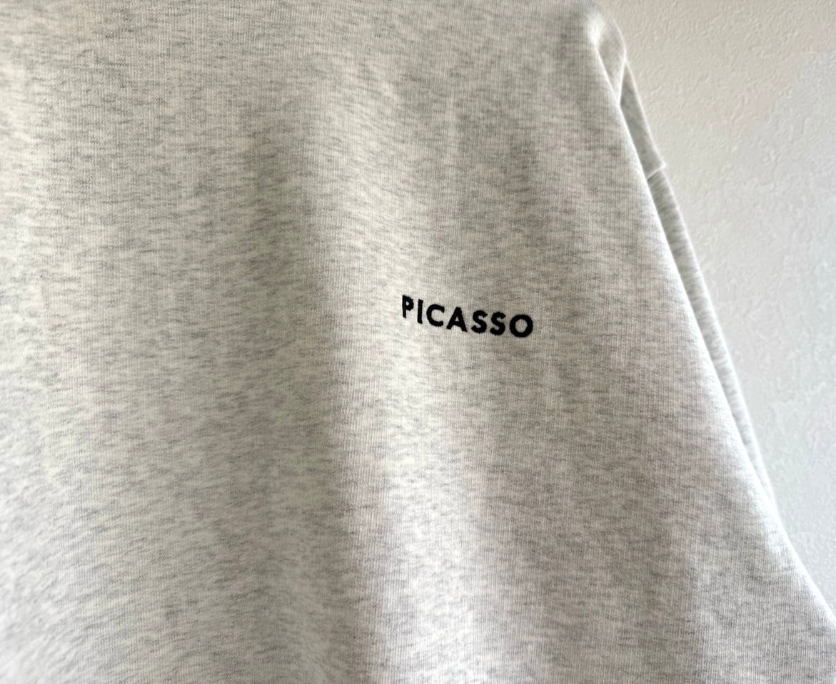 パブロ・ピカソの日常を覗き見たような、彼のユーモアさが感じられる一枚をバックプリント。フロントにはシンプルにPICASSOのロゴを刺繍。