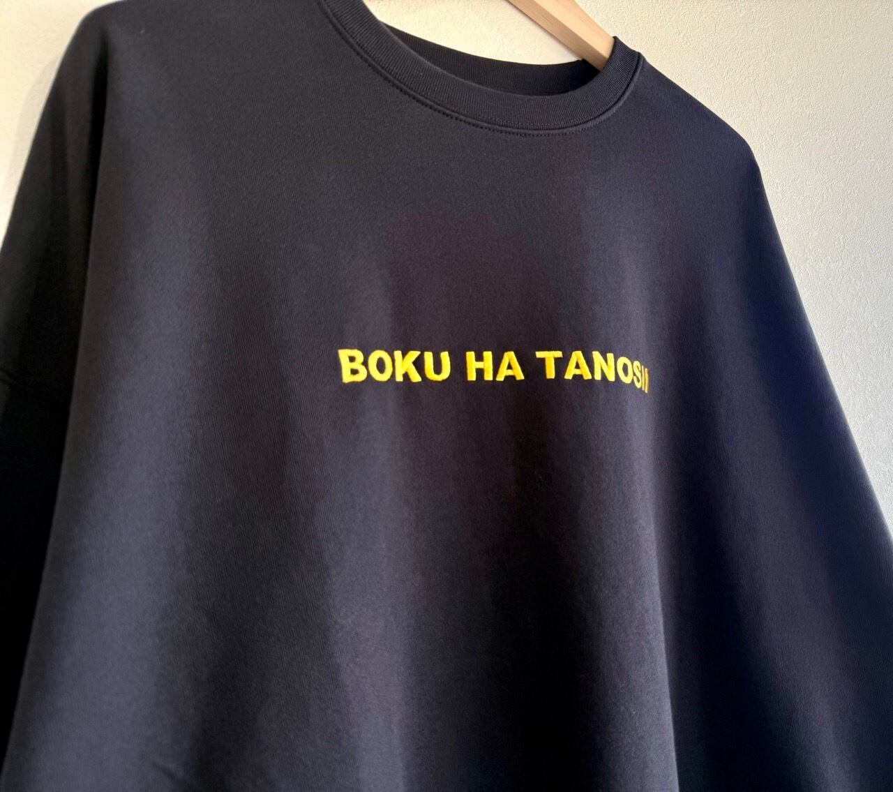 ネイビーボディにイエロー刺繍で施されたBOKU HA TANOSII