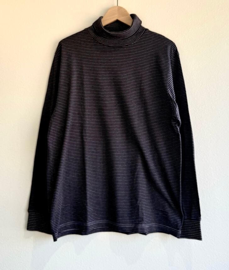 無地感覚で着られる細ピッチボーダーTシャツ、新型のタートルネック。綿2種類・ポリエステル1種類の染着差を利用し、染色するとストライプが浮き出てくる特注素材を使用しています。