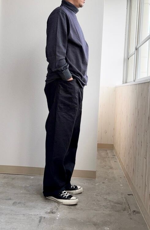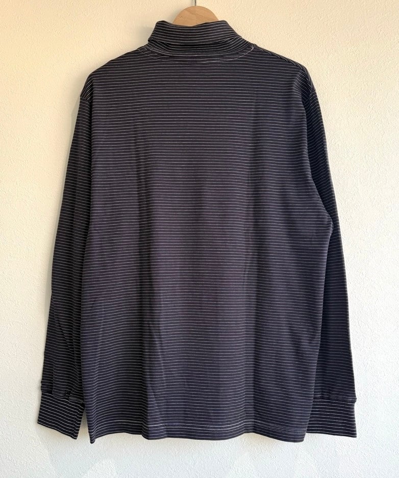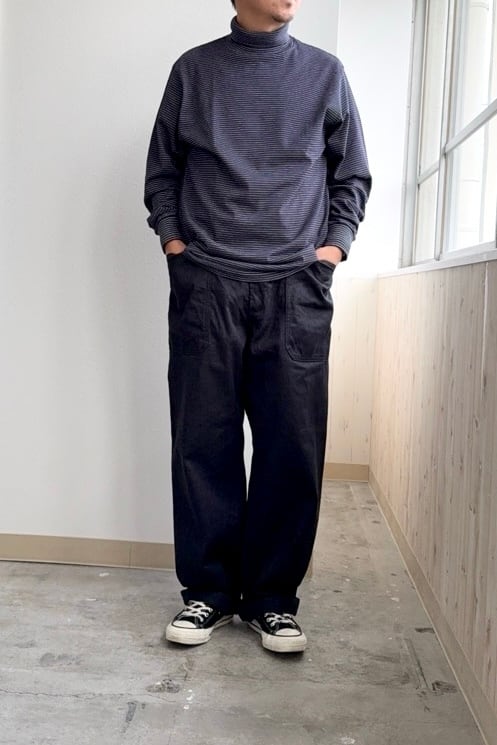 適度にゆとりのあるシルエットで着心地の良い、Yonetomi(米富繊維)のガーメントダイ ボーダーTシャツ〈タートルネック・長袖〉。