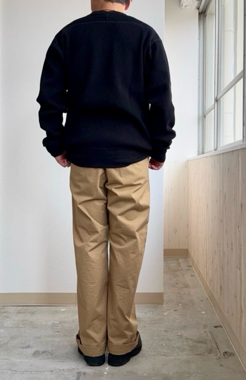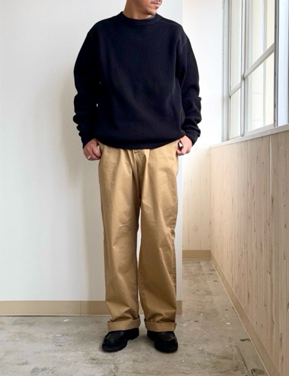 USコットンに強撚を加えて度詰めで編み立てることで、ワッフル特有の伸びやすいマイナス面を軽減しバルキーな風合いに仕上がっています。
