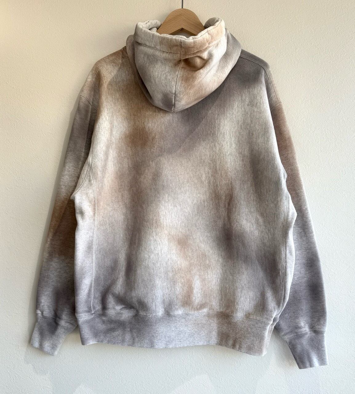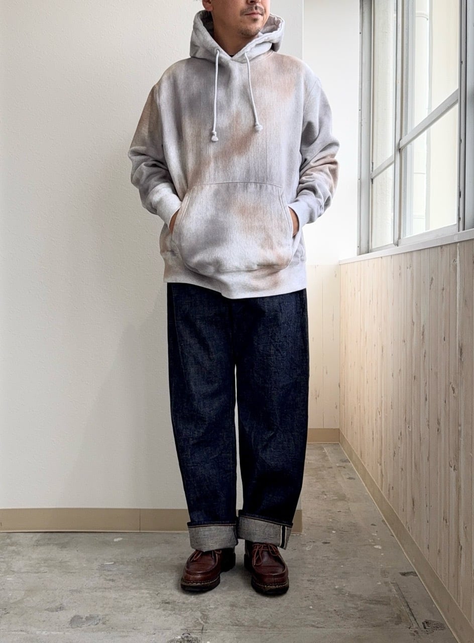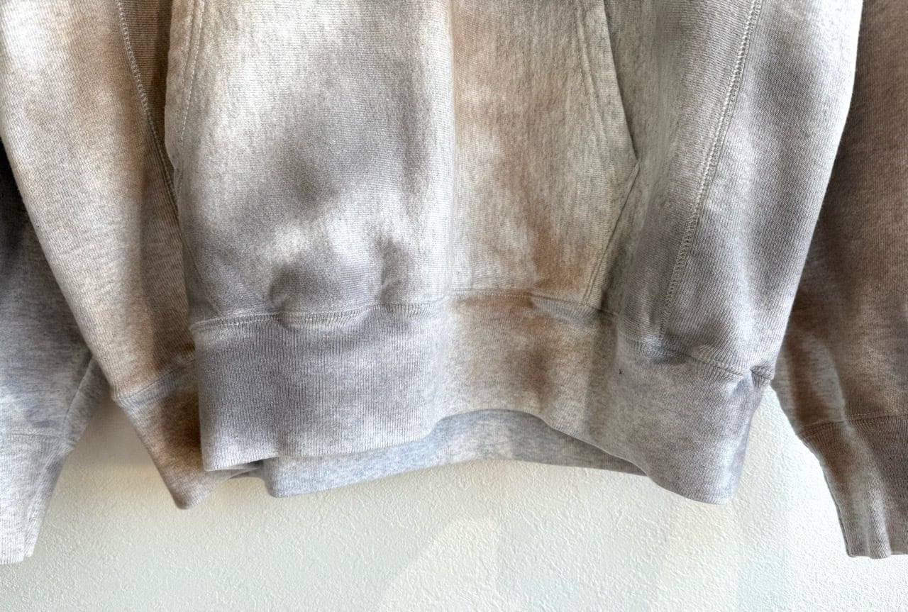 王道のグレーカラーに、ヴィンテージの雰囲気を高めるUSED加工とムラスプレーを施した表情豊かな一着です。